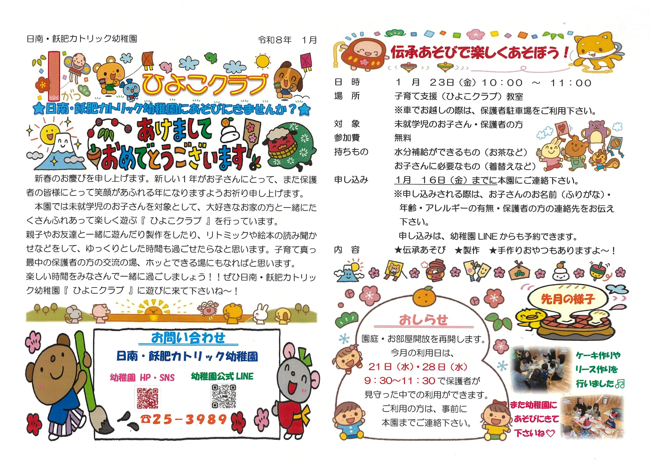 1/23ひよこクラブ開催! 2026年1月10日2026年1月10日 nichinan-obi 新年一回目の今回は、お正月に因んで伝承あそびを計画してみました。本園自慢の手作りおやつも味わっていただきますよ!ぜひご参加くださいヽ(^o^)丿