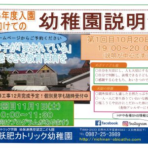 10月と11月に入園説明を行います。全ての子どもさんが、「愛されている」と実感できる教育保育をどのように進めているのか丁寧にご説明します。お電話、又は本ホームページの「お問い合わせ・お申込み」から簡単に予約できます。ぜひ …