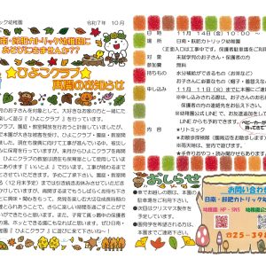 8月の地震で2階部分の保育室が被災。幸い人的被害はありませんでしたが、現在も「ひよこクラブ」のお部屋も保育室として使わなくてはならない状況です。大変申し訳ありませんが、本年度のひよこクラブはここで終了とさせていただきます …