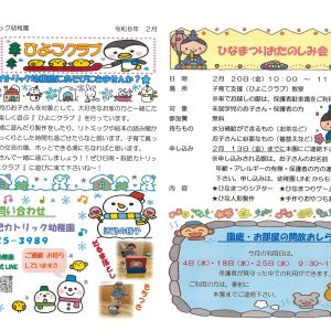 今回は、ひなまつり直前!ということで、ひなまつりシアターやひなまつりゲームなど、桃の節句にちなんだ内容を計画しました。好評の「本園手作りのおやつ」もありますよ!ぜひご予約(〆切2/13)くださいヽ(^o^)丿